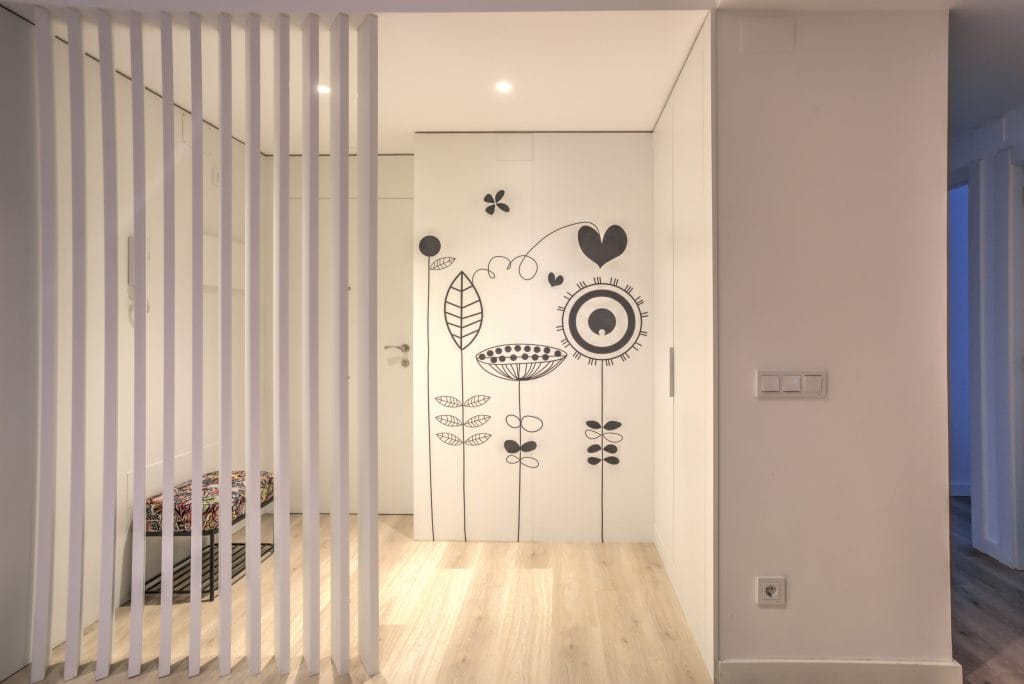 En aquest habitatge s’amplien els espais suprimint els elements propis d’obra. Per crear la sensació d’espai obert i lluminós. L’aprofitament de l’espai és més gran, eliminar les parets i portes, amplia visualment el espai i elimina metres quadrats de passos i accessos.